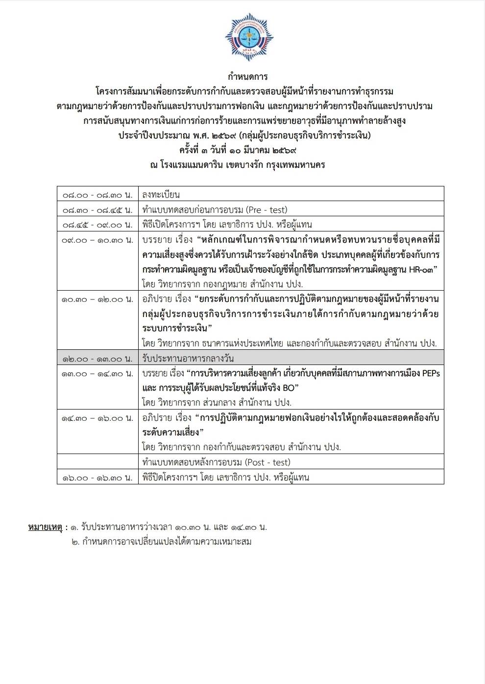 ขอเชิญเข้าร่วมโครงการสัมมนาเพื่อยกระดับการกำกับและตรวจสอบผู้มีหน้าที่รายงานการทำธุรกรรมตามกฎหมายว่าด้วยการป้องกันและปราบปรามการฟอกเงินและกฎหมายว่าด้วยการป้องกันและปราบปรามการสนับสนุนทางการเงินแก่การก่อการร้ายและการแพร่ขยายอาวุธที่มีอานุภาพทำลายล้างสูงประจำปีงบประมาณ พ.ศ. 2569 (กลุ่มผู้ประกอบธุรกิจบริการชำระเงิน) วันที่ 10 มีนาคม 2569 ณ โรงแรมแมนดาริน เขตบางรัก กรุงเทพมหานคร